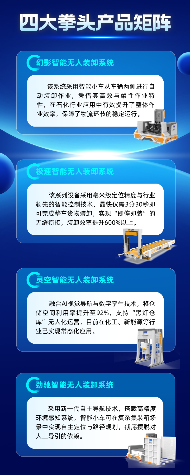 幻影/灵空/极速/劲驰四大产品线:全面覆盖国内公路运输所有车型,包括后装式集装箱车、飞翼式集装箱车、卷帘车、边栏板可拆放及不可拆放平板车等终端物料发货装车,装车过程实现自动化、智能化操作,20分钟内完成30吨货物装车,产品填补国内终端物料智能无人装车空白,可完全替代国外进口产品,获评省内首台(套)重大技术装备4项、省级重点新产品9项。
