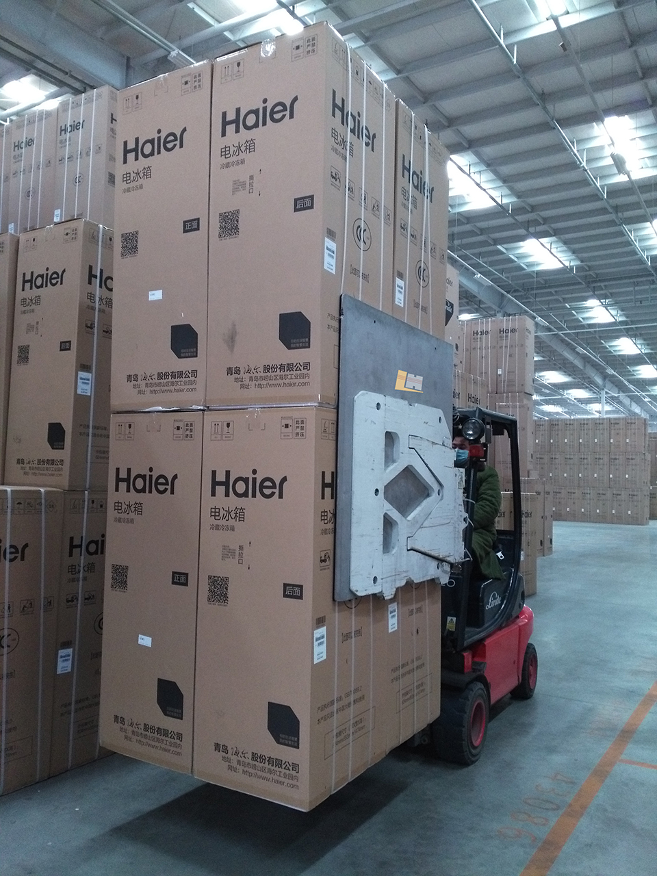 龙合智能在普通纸箱夹的性能基础上,采用侧向移动式夹臂,使夹持和侧移动作更加顺畅;亦可根据不同客户的使用习惯要求,选择硫化金属橡胶板或粘接式橡胶皮配置在铝合金夹板上,同时借助出厂标准配置的四档调压阀,操作者能够按照所夹持和搬运的白色家电货物的耐压程度对液压系统的压力进行手动调节,既保证了夹持作业时不会将货物夹变形或夹坏,又提高了作业效率及安全性、降低运行成本。