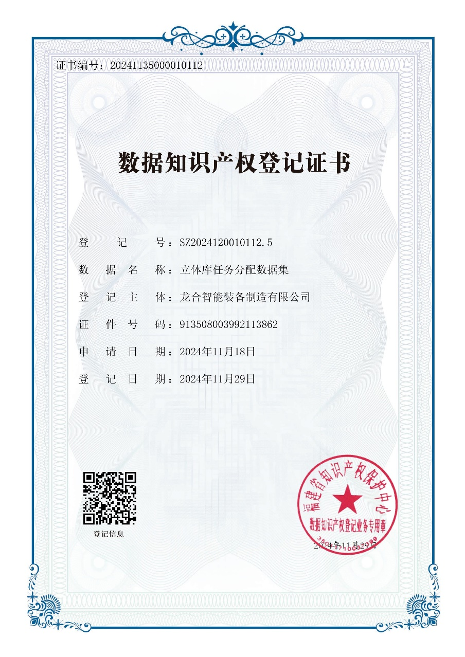 近日,龙合智能首次进行数据知识产权登记,登记项目“立体库任务分配数据集”获福建省知识产权保护中心授予数据知识产权登记证书。