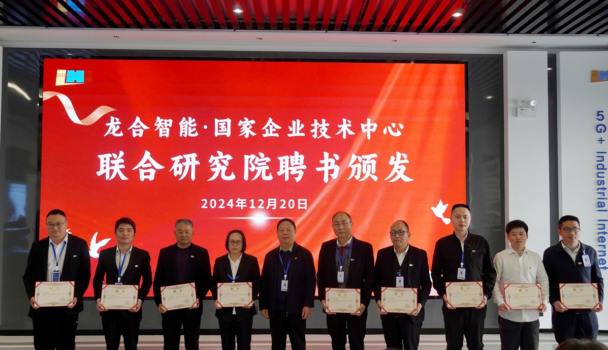 2024年12月20日上午,龙合智能国家企业技术中心联合研究院揭牌仪式活动在公司数字化展厅圆满举行。龙岩市发改委党组成员、副主任魏富明,市科技局党组成员、副局长吴滨德,市工信局副局长彭立颖以及龙岩高新区(经开区)管委会副主任邱和盛出席了本次活动,同时原福建商学院副校长、福州大学教授/博导杨晓翔教授,福州大学机械及自动化学院机械设计系主任郭金泉教授,集美大学海洋装备与机械工程学院实验室主任黄种明,中国科学院海西研究院泉州装备制造研究中心高级工程师孙波等专家学者作为合作科研院所代表出席,龙合智能董事长杨静、总经理林伟及联合研究院全体成员等参加。