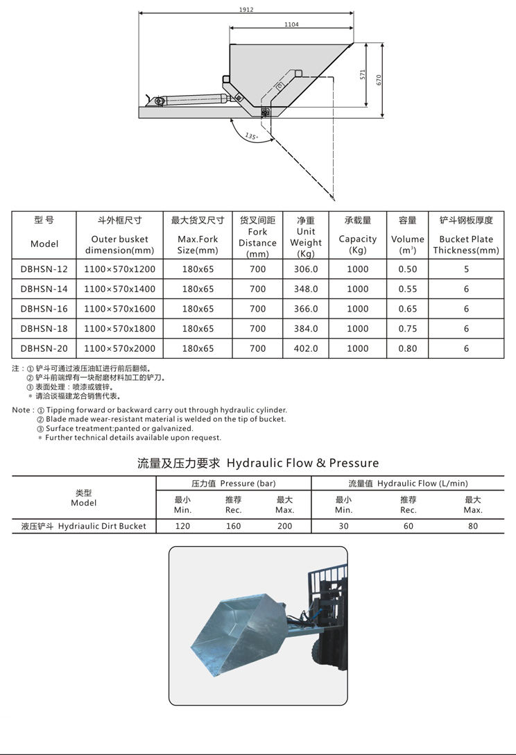该产斗可通过液压油缸进行前后翻倾,应用于装卸疏松货物,如:沙子、煤、谷物、混凝土等。